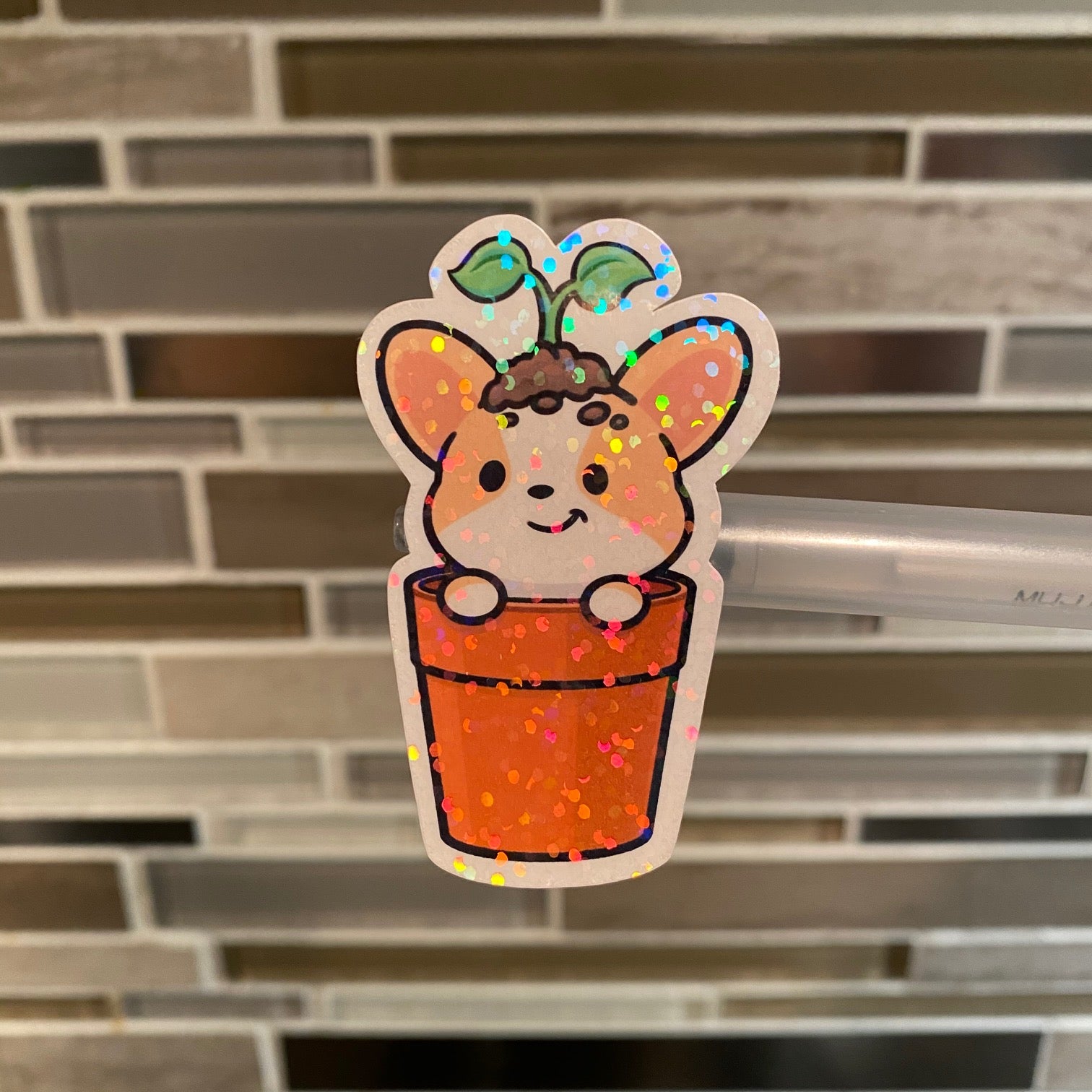 Miso being adorable in a potted plant confetti holographic die cut sticker. This is one of our most popular designs turned into a cute, decorative sticker!
